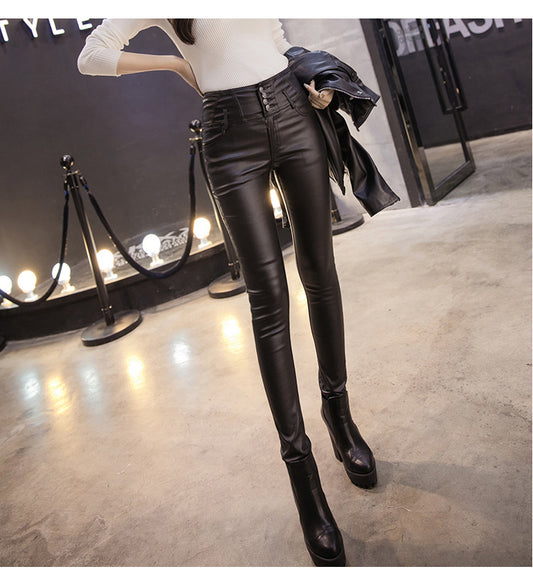 Women Leather Pants - High-Waisted Slim Fit - Button Details - Elegant Look